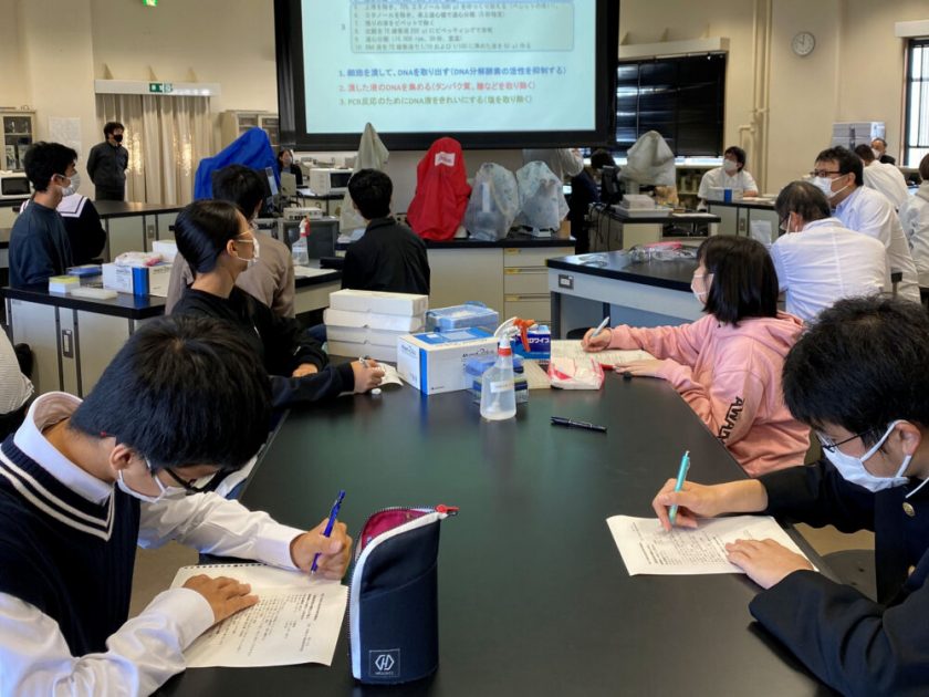 文化部/部活動 令和3年度 高文連自然科学専門部講習会(名古屋大学農学部実験講習会) 2021年10月23日 名古屋大学農学部で開かれた実験講習会に理化部7名で参加してきました。 実験のタイトルは、「植物病原菌の観察および検出」というもので、講義に引き続いて大学の先生やTAの方たちに指導を受けながら操作を行いました。 遠心分離機やPCR機、電気泳動装置など高校にはない高価な機械を使って植物や病原菌のDNAを抽出、増幅して分析しました。ニュースでよく聞くPCRや2年生の理型の生物の授業で学んだばかりの実験を自分の手で行ったことはとても有意義でした。 講義の様子 実験の様子1 実験の様子2