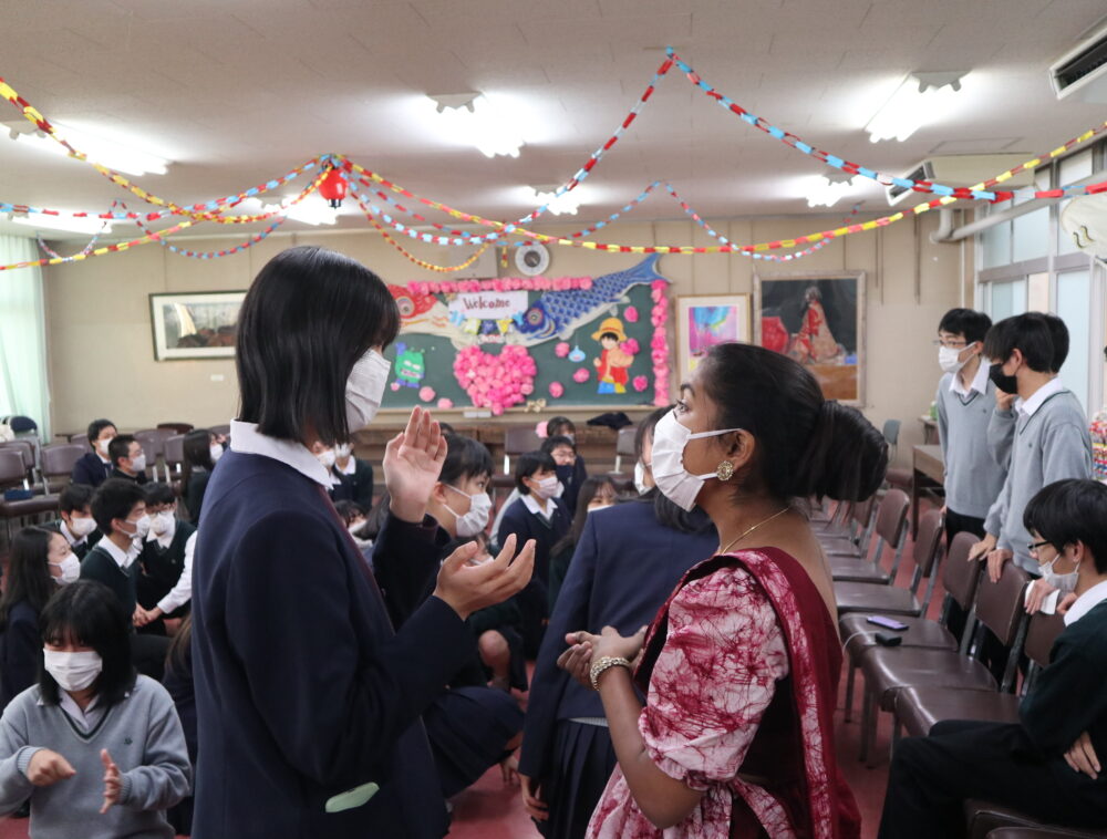 国際交流 留学生ウェルカムパーティ開催 2021年11月12日 本年度も新型コロナウイルスのため来日が遅れましたが、令和3年11月からアジア高校生架け橋プロジェクト生としてスリランカからLeena(リーナ)さんが来てくれました。本校の2年生と一緒に3月まで5カ月間学びます。