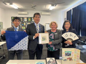最初に、本校生徒たちは自作の切り絵で作った浮世絵を贈り、帰る時にはお世話になった方々へ折り紙で感謝の手紙を書きました。