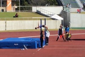 本校からは、2年生の森下開陸君が走高跳に出場。出場者ランキング10位で、入賞も視野に入れて乗り込みました。