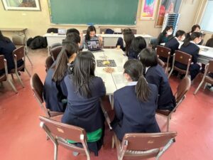 本校生徒たちは、約40名参加し、PTA国際交流委員会の保護者の方がご用意くださった、目の前にあるポテトチップスのような大好きなお菓子に手を出すことも忘れ、お話に聞き入っていました。生徒たちは、6人のテーブルを回って、一人一人のお話を聞くことができました。異文化に触れ、多様な英語を聞くことができただけではなく、たったの1時間で世界中を旅したような、貴重な経験になったと思います。