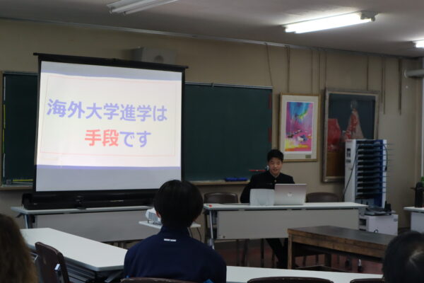 令和6年3月5日(火)、海外大学進学を決めた生徒1名と、海外留学から戻ってきた生徒1名による報告会を実施しました。