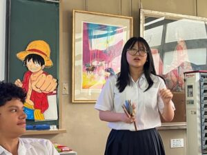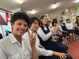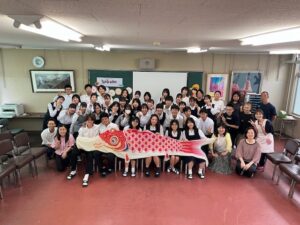 たくさんの生徒たちが、マリエさんとその他の在籍する留学生たちと新しく仲間に入る2人を囲み、新しく作成した学校紹介動画を見せた後に、昭和高校クイズと昭和フルーツバスケットのゲームを楽しみ、笑いがいっぱいの楽しいひと時を過ごしました。