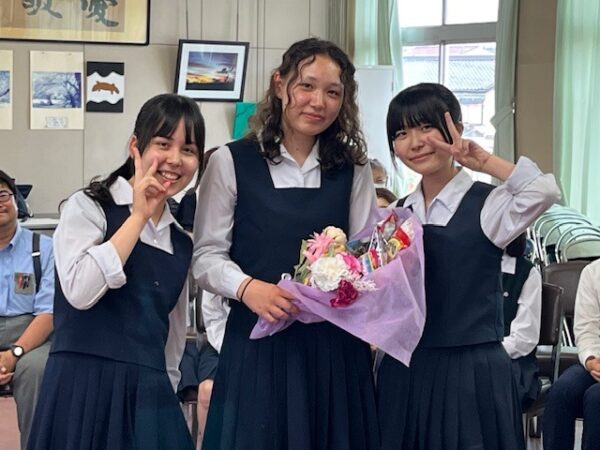帰国するマリエさんには、お菓子で作った花束が手渡され、2年生の生徒から心のこもった別れを惜しむスピーチがありました。そして、マリエさんからも昭和高校での思い出を語るスピーチをしてもらいました。長期滞在の生徒と本校生徒との友情と強い結びつきを感じました。