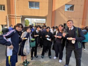 最終日6日(金)には、Welcome委員会主催の「ランチ・フェアウェル・パーティー」を中庭で開催しました。生徒たちが一品ずつ持ち寄って、テーブルに並べて一緒に食事を楽しみました。少し寒い中庭での会でしたが、多くの生徒たちが、さまざまな食事を楽しみました。