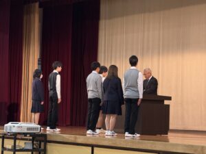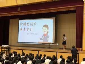 4月25日に前期生徒集会が開催され、前期生徒会執行部の認証式が行われました。新しい生徒会執行部からは、前期生徒会が掲げるスローガンをもとに、活動の基本方針について説明があり、全生徒にしっかりと共有されました。