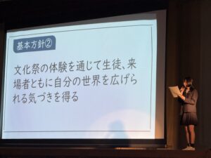 また、学園祭実行委員会からは、班長の自己紹介の後、今年度の文化祭のスローガンが発表され、文化祭に向けての説明が行われました。昨年よりも一層楽しめる文化祭を目指してまいります。