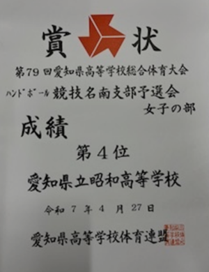 運動部/部活動 県大会出場!愛知県高等学校総合体育大会ハンドボール競技名南支部大会 2025年5月8日 4月19日・20日・27日の3日間で、総体予選が行われました。 昨年の新人戦に続き、名南支部4位という結果で県大会出場を決めることができました。3年生にとっては最後の大会、緊張の中、これまでの練習の成果を出し、チーム一丸となって戦うことのできた大会でした。 次は、県大会です。ベスト16という成績を超えれるよう日々課題を持って練習に励んでいます。すべての力を出し切って、笑顔で戦い続けたいと思いますので、応援よろしくお願いします。