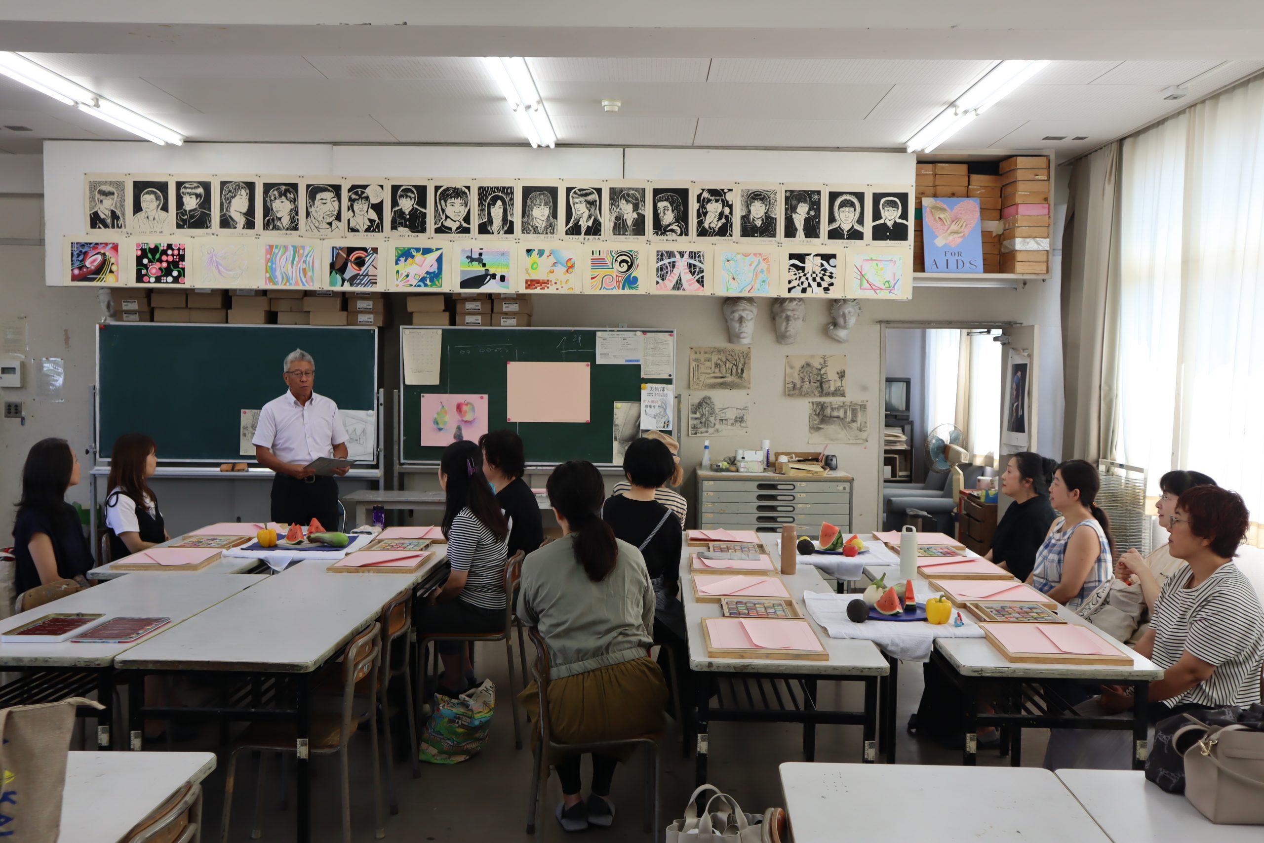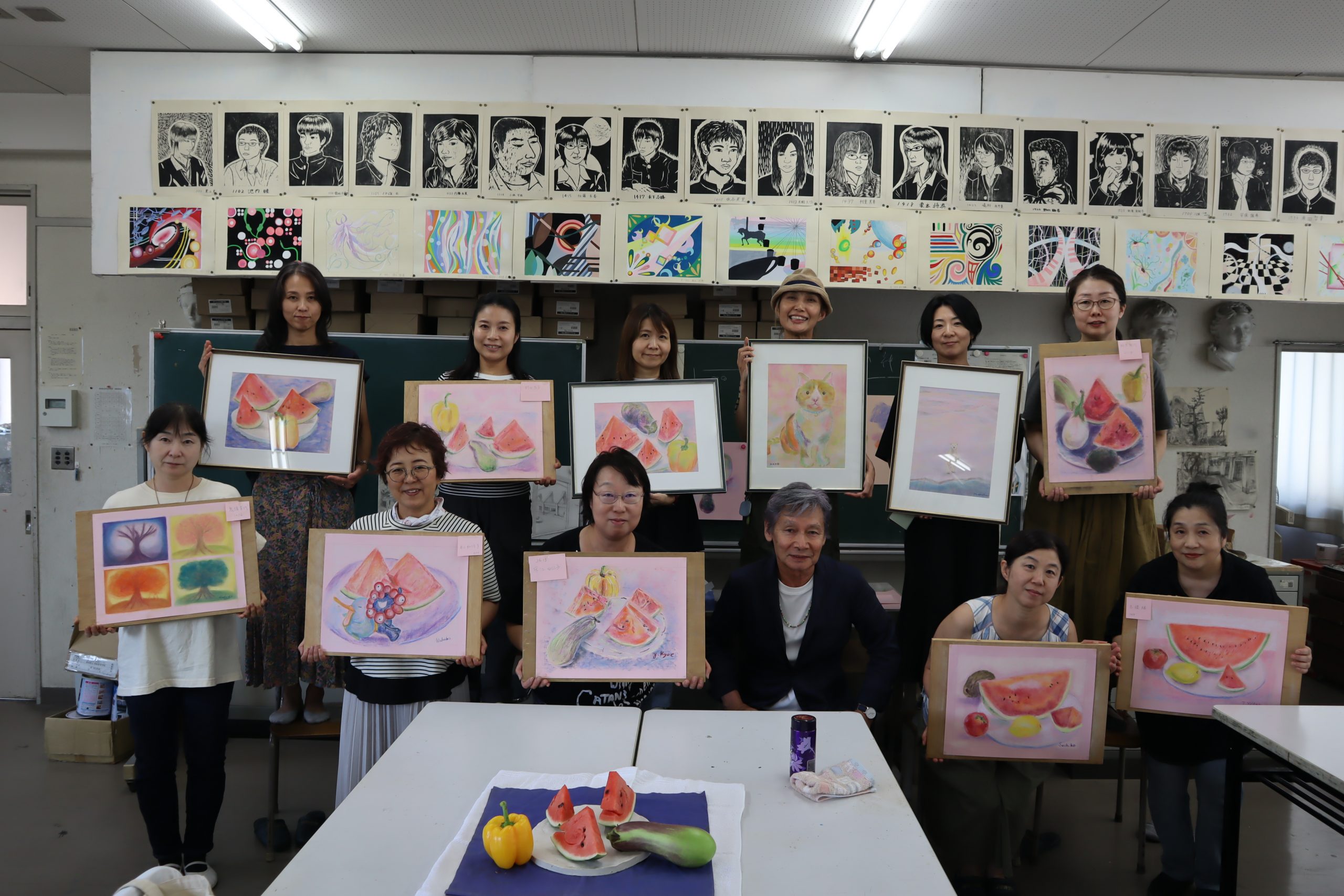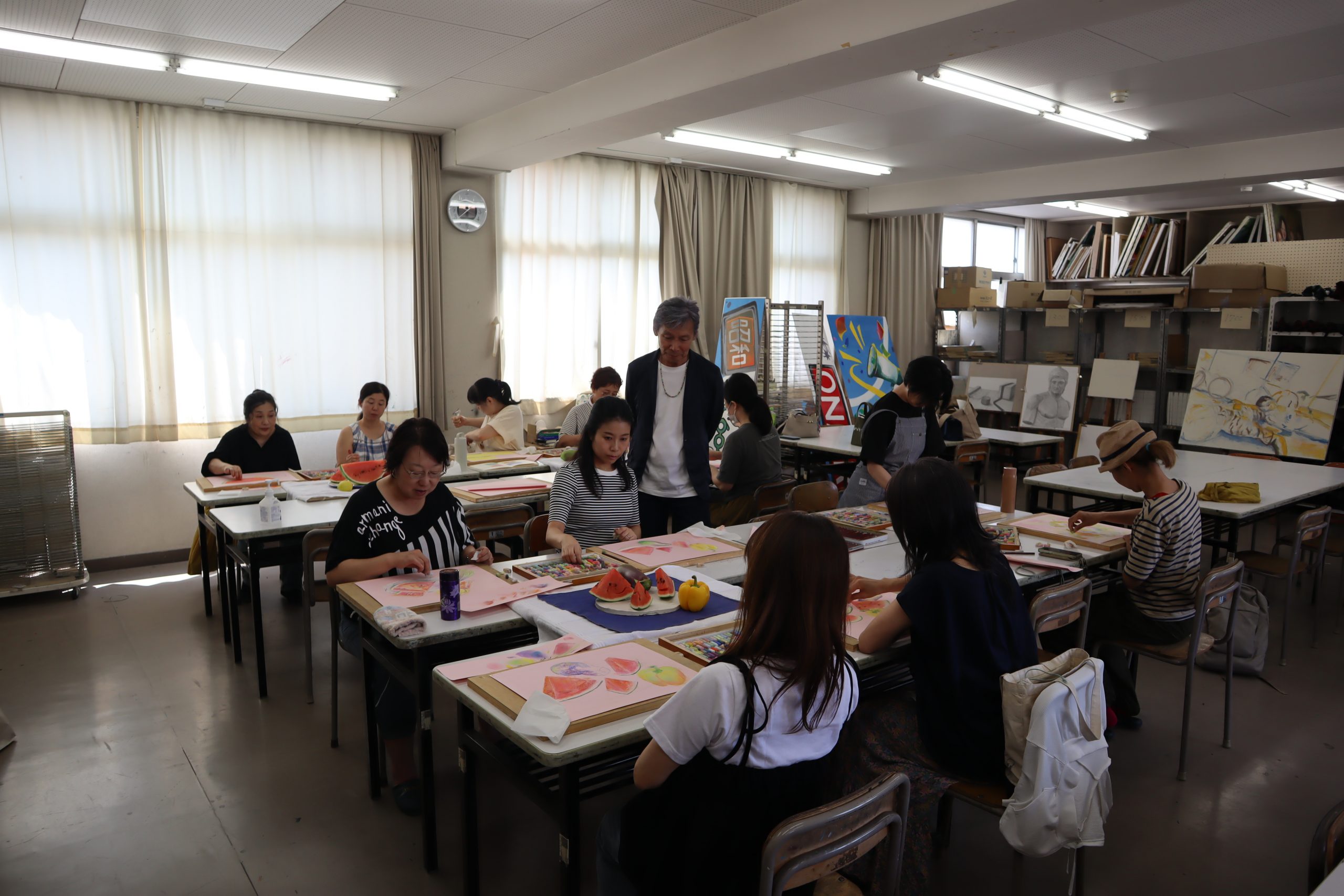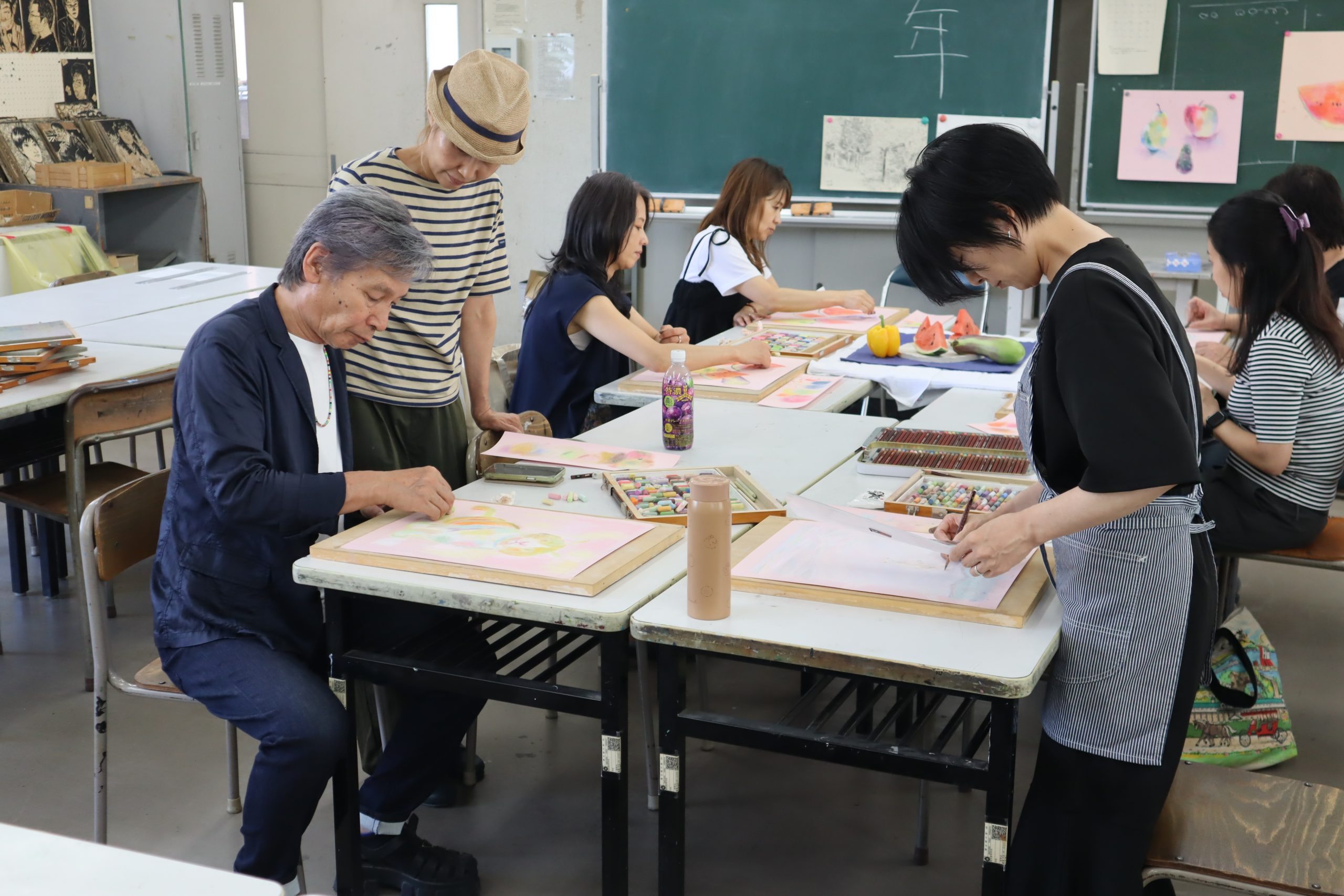 PTA/学校生活 令和7年度 PTAパステル画講習会を開催しました。 2025年8月21日 8月20日(水)、本校元美術科教員である鈴木年(すずき すすむ)先生によるパステル画講習会を、11名のPTA会員(保護者)が受講しました。先生のわかりやすい指導を受けながら、例年以上に鮮やかな作品が制作されました。 なお、制作作品は9月13日(土)のPTA学園祭企画「昭高菓房」の会場に展示する予定です。