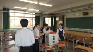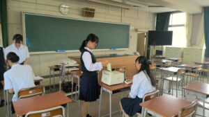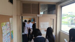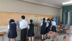 7/9(水)から11(金)の3日間の昼休みと授業後の時間のいずれか都合のつく時に、生徒自ら模擬投票所(本校社会科教室)へ足を運ぶ形で実施しました。
