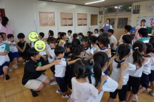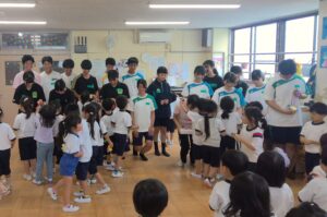 前半は園児のみなさんと生徒全員で「じゃんけん列車」と「ジェスチャーゲーム」をして全員で交流をしました。じゃんけん列車では最終的にとても長い列が出来ました。ジェスチャーゲームでは生徒が考えたお題に対して、上手に演技をしてみんなで見事当ててくれたりして、全員でとても盛り上がりました。