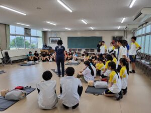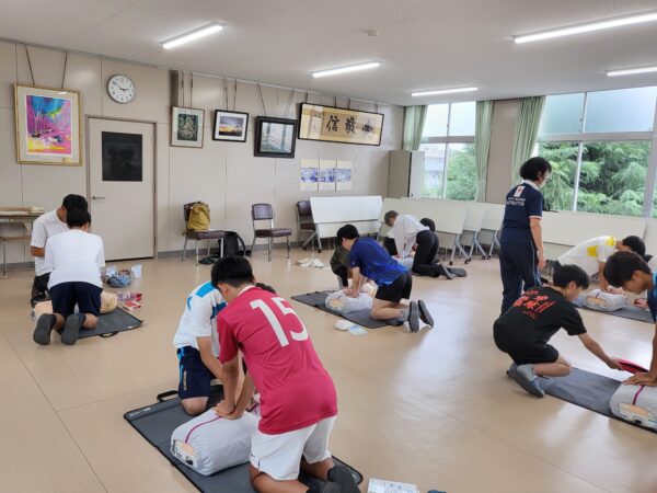 7月17日(木)午後にAED講習会を日本赤十字社愛知県支部の指導員の先生を2名お招きし実施しました。今年度は文化部と運動部に分かれ、2回に分けて実施したところ、活動場所の会議室に余裕が出来て、じっくりと実技に集中して行えました。