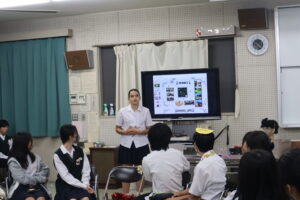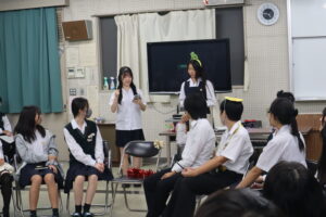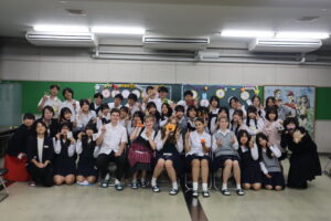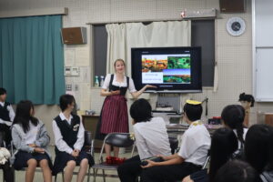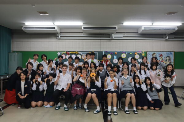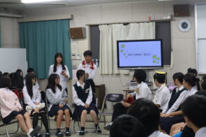 令和7年9月から新しくドイツよりエマさん、10月からフランスよりリムさんを迎え、歓迎する会を令和7年10月10日(金)に行いました。お決まりのウェルカム動画とスピーチの後に、2人にはドイツ、フランスの文化を紹介してもらいました。エマさんはドイツの民族衣装を着用し、日本語で文化紹介、リムさんはミニフランス語講座を盛り込むなど発表に工夫がなされ、生徒たちが興味津々で聞いている様子がうかがえました。そして10月といえば日本でもすっかり定着したイベント「ハロウィン」にちなんだクイズやゲームをして、とても楽しいひと時を過ごしました。