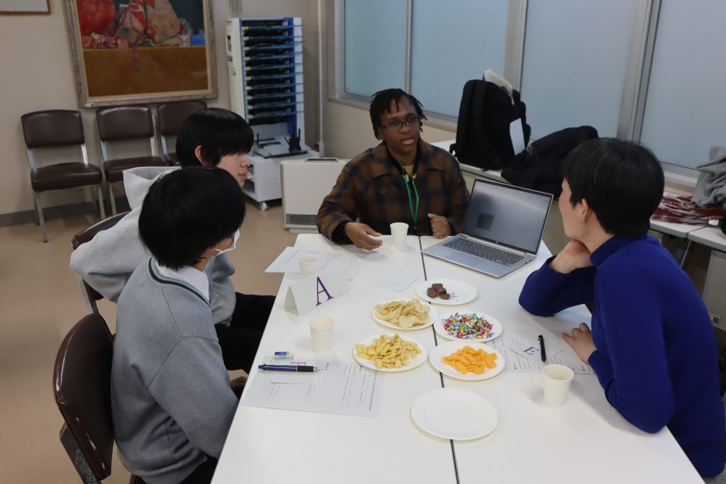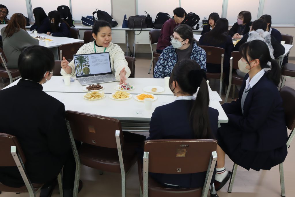 本校生徒たちは、約20名参加し、6人の留学生のテーブルを回って、一人一人のお話を聞くことができました。PTA国際交流委員会の保護者の方がご用意くださった、目の前にあるお菓子に手を出すことも忘れ、お話に集中していました。異文化に触れ、多様な英語を聞くことができただけでなく、留学生のみなさんそれぞれが専攻している内容を分かりやすく説明していただき、たった1時間で世界中の旅をするとともに、地球規模で同じ課題に対して解決していこうとする決意も持て、貴重な経験になりました。