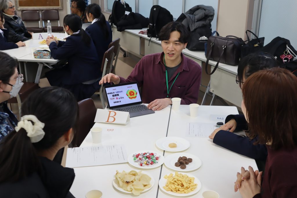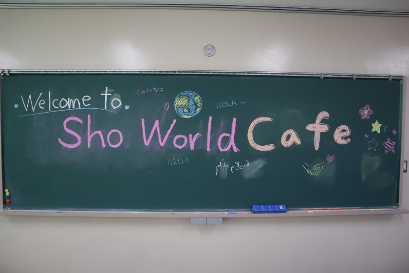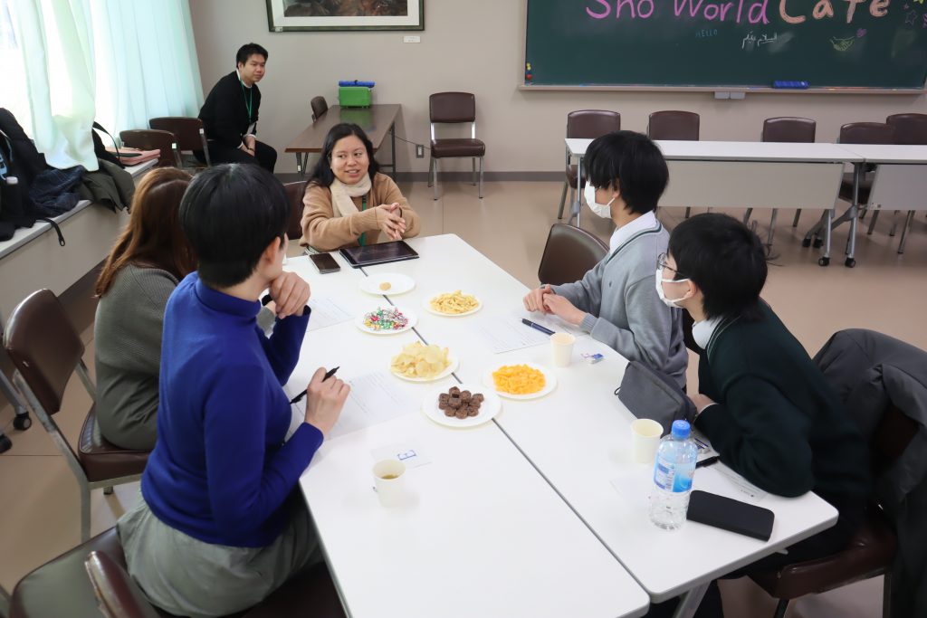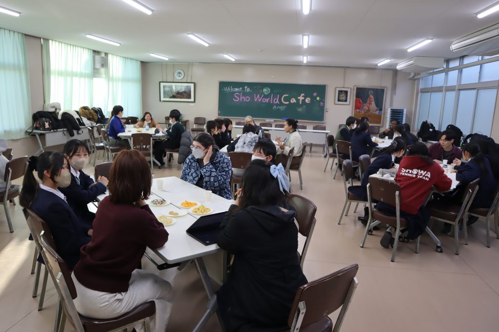 令和8年1月28日(水)に、名古屋大学EIUPのご協力により、大学院在籍の留学生6名と引率1名の合計7名をお招きした「Sho World Café(ショウワールド・カフェ)」というイベントで、参加生徒たちは文化交流を楽しみました。