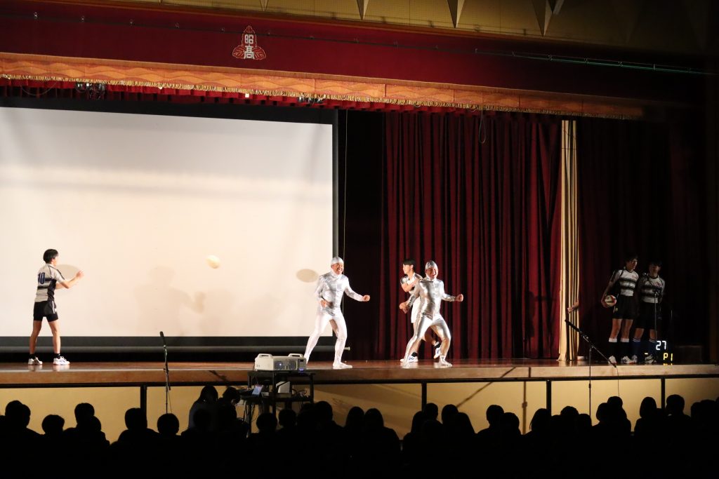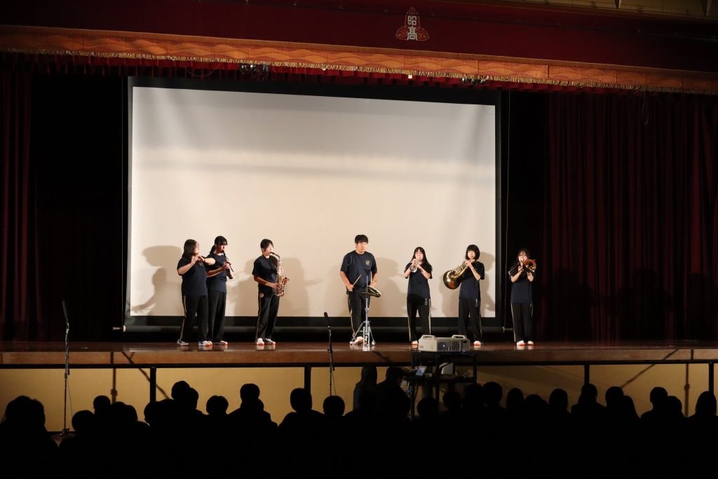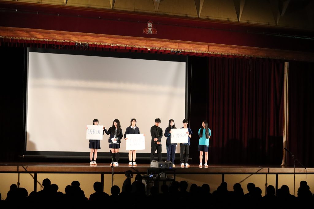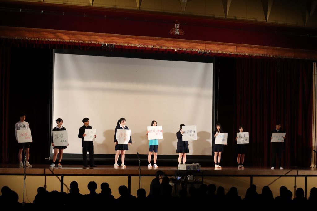 学校行事/生徒会活動 令和8年度 新入生歓迎会を実施しました。 2026年4月7日 令和8年4月7日、新入生歓迎会を実施しました。本行事は、準備から当日の運営までを在校生が主体となって行い、新入生を温かく迎える会となりました。 当日は、合唱部による校歌披露をはじめ、生徒会委員会の紹介、生徒会執行部による学校紹介、国際交流活動の紹介、そして各部活動による「45秒アピール」が行われました。どの発表も工夫にあふれ、新入生にとって本校での学校生活を具体的にイメージできる内容となりました。会場は終始和やかな雰囲気に包まれ、新入生も楽しみながら参加している様子が見られました。