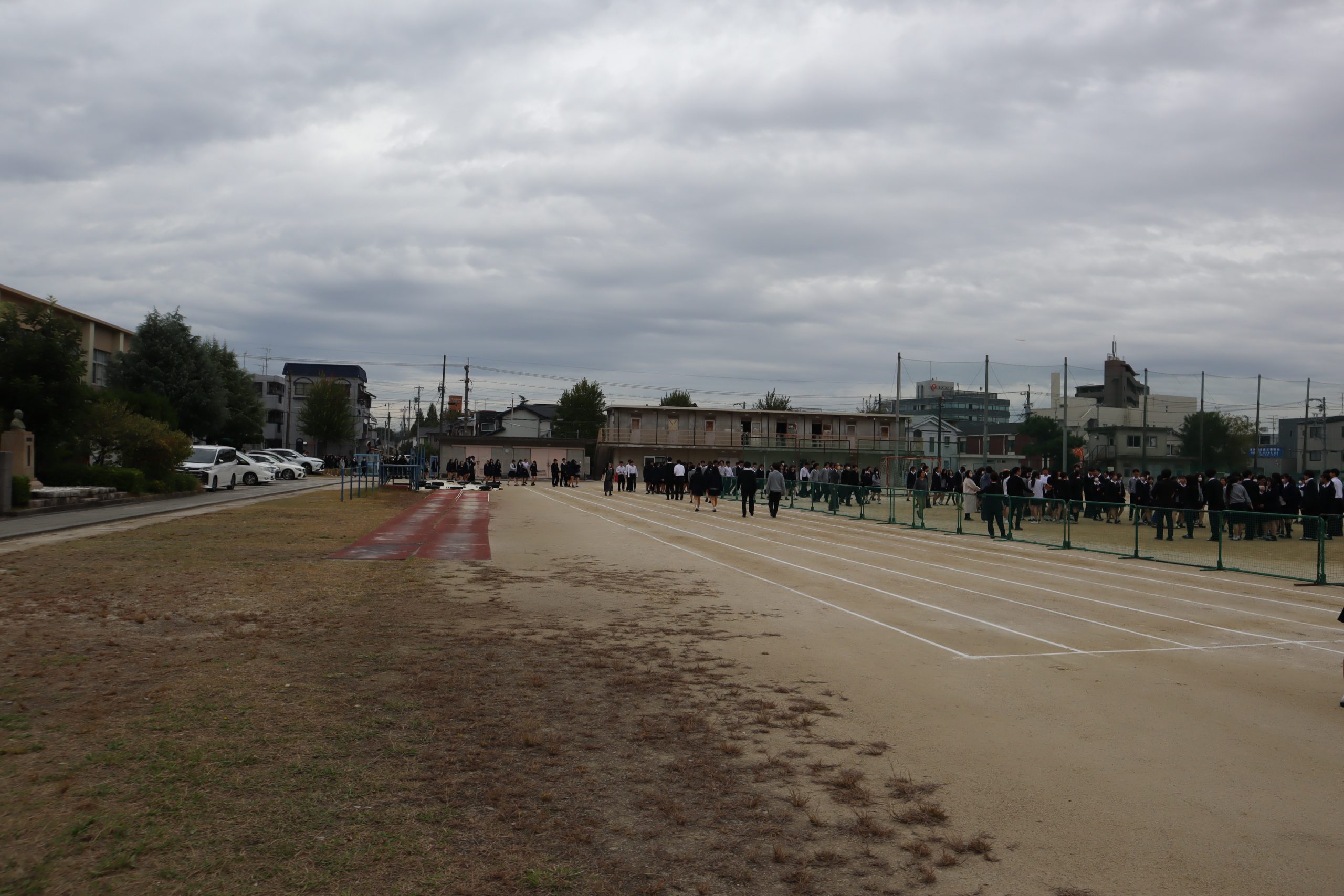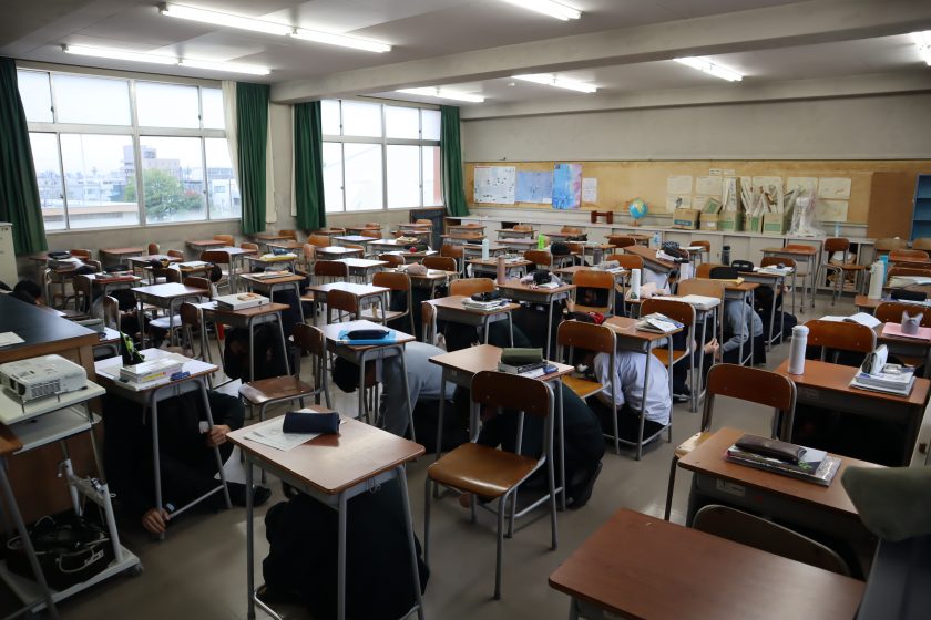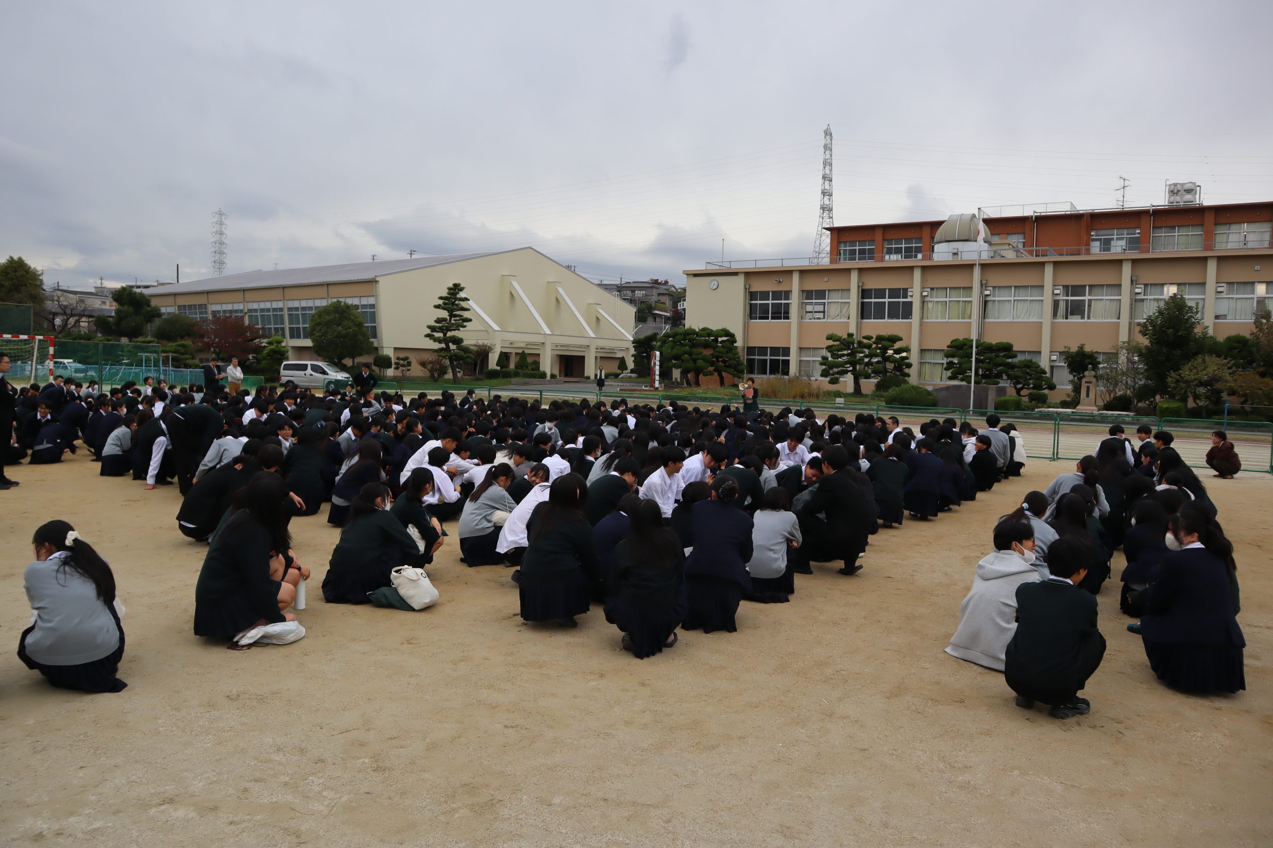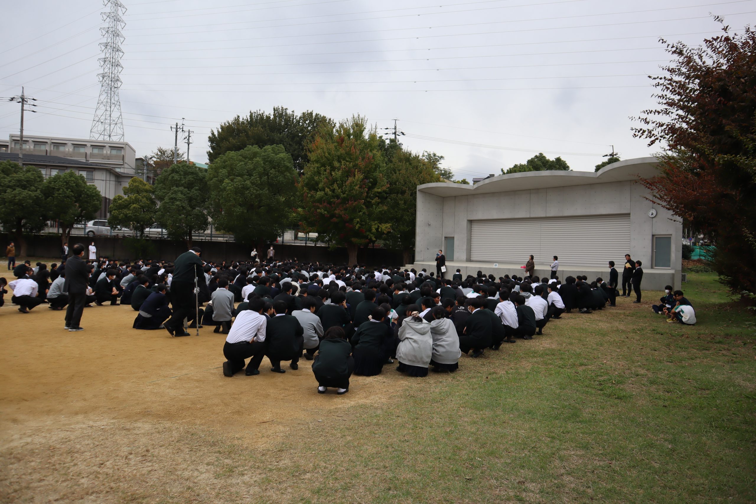 今回は、生徒に具体的な日時を予告しない形で避難訓練を実施しました。地震を想定した安全確保行動をとった後、グランドと昭ステージ前に分かれて避難を行いました。クラスが分かれて授業をしている場合や、ケガ人の発生を想定して行動する場合など、より実践的な形での防災訓練となりました。