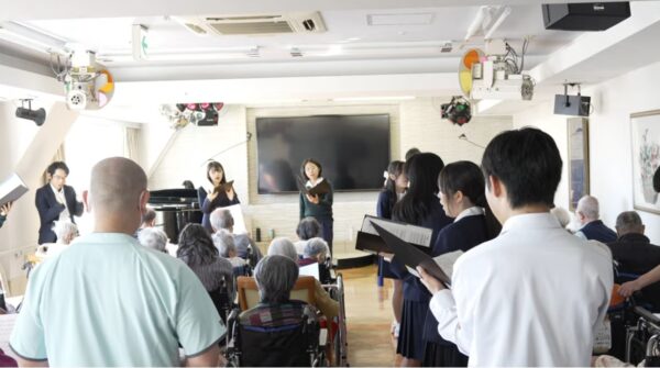 施設の方々は、手拍子をしてくださったり、一緒に口ずさんでくださったりと、大変温かく迎えてくださいました。
