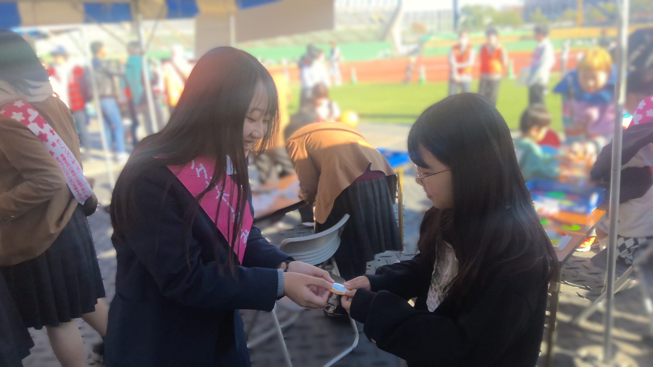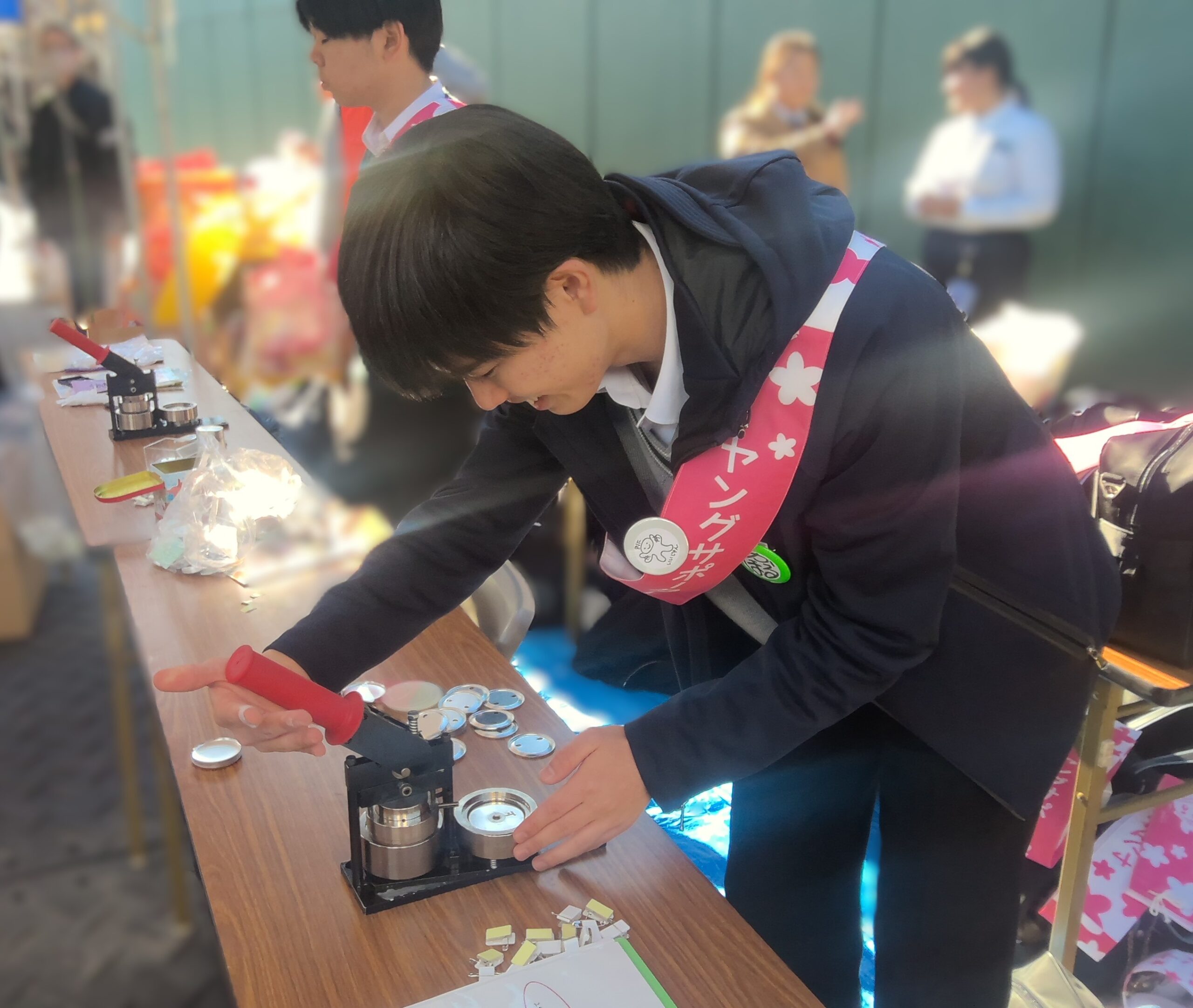 当日は、来場者のみなさんに向けて缶バッジ製作体験の手伝いや、アンケート収集など、地域の方々と交流しながら積極的に活動しました。