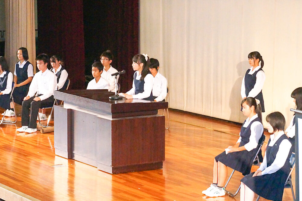 6名の生徒会役員が、行事や生徒集会の企画・運営、広報活動や予算作成などを行います。11の委員会による活動も、日々の学校生活を支えてくれています。委員会から出た案は、各ホームルームの代表が集まる生徒議会できちんと話し合われたのち、実施されます。